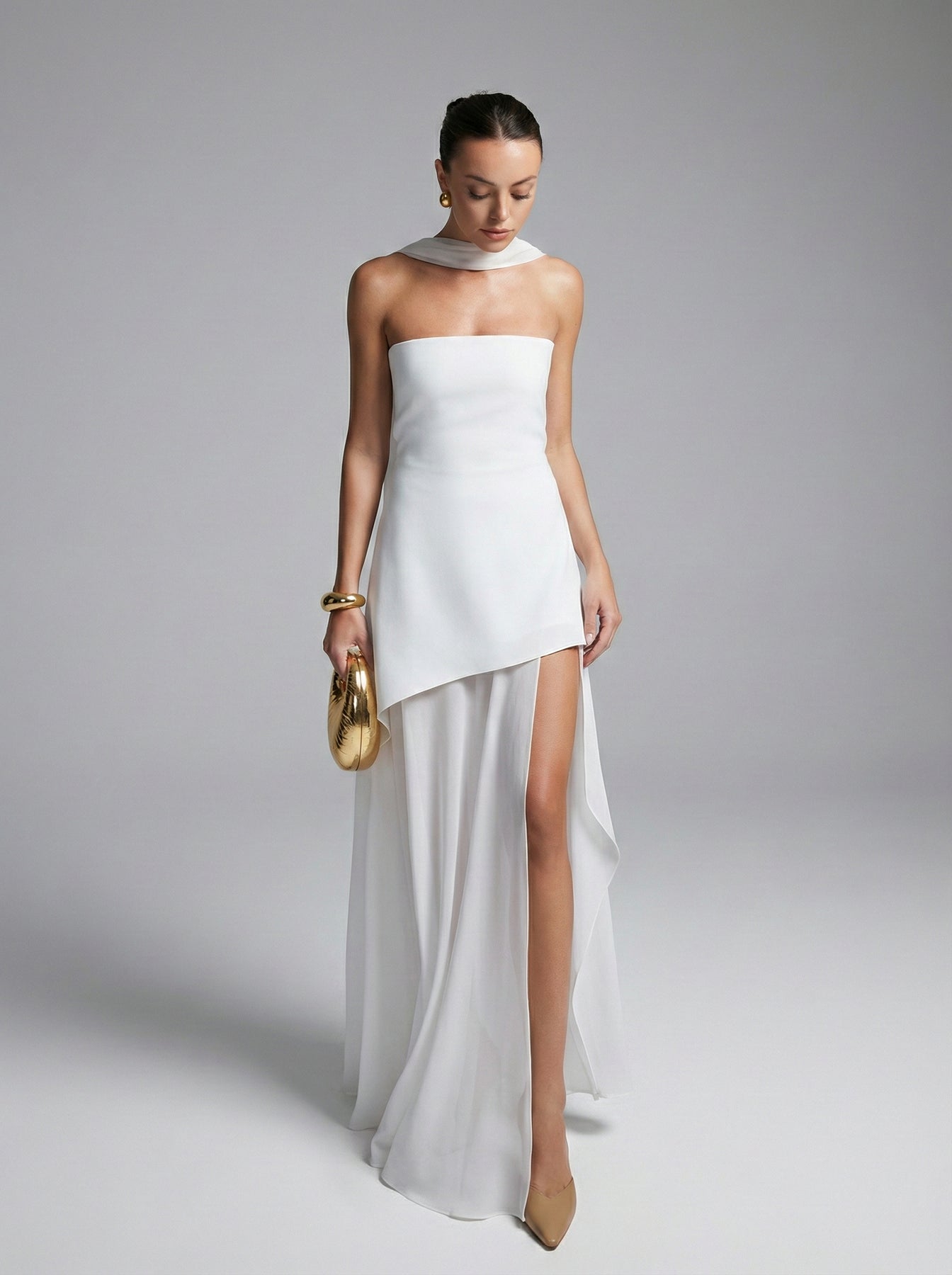 L’abito lungo donna Elena con spacco unisce una linea a fascia pulita e un taglio asimmetrico, per un look elegante che slancia con naturalezza.
