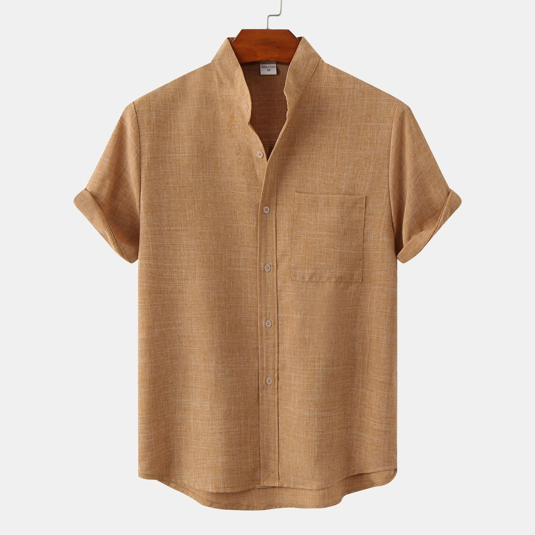 Il design essenziale si riconosce dal colletto alla coreana, dalla chiusura frontale con bottoni e dal taschino sul petto che aggiunge un dettaglio pratico senza appesantire. Le maniche hanno un risvolto curato e la linea generale resta morbida ma composta, ideale se cerchi una camicia casual uomo che non sembri mai trasandata.